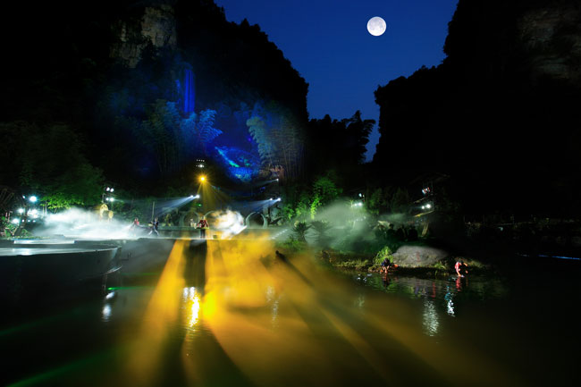 《武陵魂•梯瑪神歌》是一場記述土家族起源、演變、戰(zhàn)爭、生產生活等內容的大型立體山水實景演出,揉合了音樂、舞蹈、文學等多種藝術形式,如幻如夢的舞美燈光,搖曳生姿的原生態(tài)歌舞……濃縮了土家族數(shù)千年的發(fā)展歷史,400多名演員以自然淳樸的表演充分的展示了土家的民族文化特征,給游客帶來了耳目一新的感受。一場視聽的饕餮盛宴,一曲驚天地、泣鬼神的曠世古歌,給人山水文化光影視聽的享受!境銎罚簭埣医缣莠斏窀栉幕瘋鞑ビ邢薰尽
