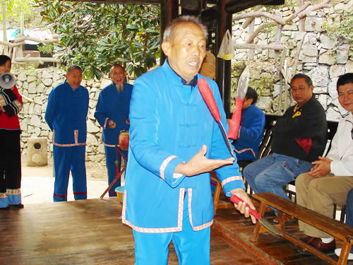 三棒鼓,是以拋三根棒和敲鑼打鼓得名,是土家山寨到處可見的一項以打擊樂器、口頭文學、表演技藝合為一體的文體活動形式。 打三棒鼓通常由三至五人組成,師傅擊鼓唱詞,一人打鑼,一人;ò、花刀。由一人表演,將鼓架擺在前面鼓架上,將鑼掛在鼓架下面,用細繩系著鑼棒套在腳板上,表演時,口唱詞、手打鼓、腳踩鑼,鑼鼓節(jié)拍是按拋花棒、花刀速度的需要而定。三棒鼓的唱詞是五言四句重復半句組成。即五字一句,四句為一節(jié)。每小節(jié)的第四句要重復半句。每一小節(jié)擊響鑼鼓四遍。前三句是每唱完擊三響,最后一句唱完即每小節(jié)結(jié)束時擊響十下。例如唱:"學打三棒鼓",打"鏘鏘鏘";唱"學又學得苦",打"鏘鏘鏘";唱"三歲學到一十五",打"鏘鏘鏘";唱"學起呀,學起走江湖",打"鏘鏘鏘、鏘、鏘、鏘鏘鏘鏘鏘-鏘"。這一小節(jié),每唱一字為一拍,"鏘"為鑼鼓同鳴聲,每聲占一拍,標點符號也占一拍。每拍的快慢取決于花棒下落的速度,任何一個花棒下落一次均為一拍。因此,如果花棒拋得低,下落的頻率就快,每拍所占時間就短,反之,花棒拋得高,每拍占的時間就長。三棒鼓的第二句和第四句都要求壓韻,一句和三句可壓可不壓. 打三棒鼓的技巧性很強,思想要高度集中,拋刀拋棒用力要適度,動作要敏捷準確,稍有疏忽大意,不但表演失敗,還會被刀劃破手腳或誤傷他人。因此,凡是學打三棒鼓者,均需經(jīng)常練習飛拋接技術(shù),做到閉目均能拋接刀棒。因此,土家族青少年經(jīng)常用三個卵石練習拋接技術(shù),久而久之,熟能生巧,不但會拋棒,而且能拋刀。 打三棒鼓的鑼鼓曲牌不變,但唱詞多種多樣,除了固定的《十二月花》等唱詞外,均為即興編詞隨口而唱,唱三棒鼓歌的人,都是腦筋靈活、口才伶俐者。 |