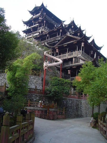 九重天 九重天世襲堂是土家風情園的精華和靈魂所在。該建筑由土家民間藝人李宏進設計,依80度陡坡而建,高48米,共9重12層,整個樓房全部用木栓連接,沒有一顆鐵釘,堪稱土家族建筑史上的奇跡。2002年9 月22日,九重天吊腳樓被載入世界吉尼斯世界紀錄,認定其為目前中國最大、最高、最完美的木質(zhì)結(jié)構(gòu)吊腳樓。2001年4月6日,朱镕基總理視察土家風情園時,對九重天贊不絕口:“一批民間匠人能造出這樣輝煌的吊腳樓,而且還解決了力學的問題,真是不簡單!鼻迦A大學著名建筑學家何重義先生說:“張家界土家風情園完全可以和蘇州的園林相媲美。特別是九重天世襲堂,猶如玉宇瓊閣,令人神往!”古人說,天有九野,地有九州,土有九山,山有九寨。古人又把九重叫做天,說天有九重,最上一重是上帝和君主居住的地方,所以我們叫它“九重天”。
