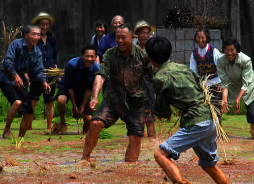 插秧活動(dòng)的最后一天,叫做“關(guān)秧門”。一丘田里,聚集了很多幫忙插秧的人,大家心里都憋著一股勁,看誰秧插得最快。速度慢人往往會(huì)被插得快的人圍住,最后關(guān)在秧田中間出不來,這叫“關(guān)豬籠”。這時(shí)候,速度快的人就會(huì)走上田埂,抓起稀泥團(tuán)朝被關(guān)了豬籠的人扔去,也有專門砸主人一身稀泥的,岸上也有人澆水。主人身上被砸的稀泥越多,主人越高興。在關(guān)秧門的最后時(shí)刻,人們會(huì)在田野里上演一場你追我趕的游戲,土家人把它叫做“糊倉”。在“糊倉”的過程中,誰也不會(huì)記仇,大家你追我趕,場面極其熱鬧。