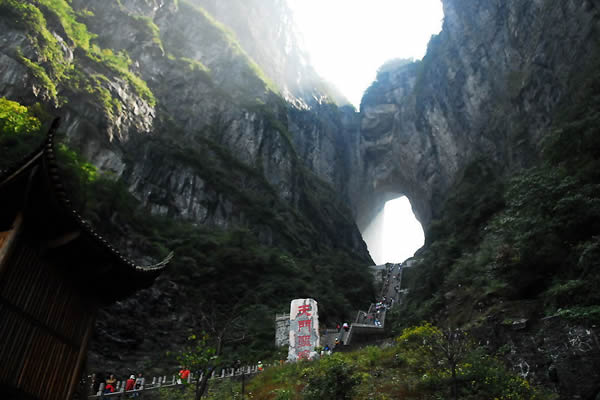 天門(mén)洞圖片 天門(mén)洞南北對(duì)開(kāi)于千尋素壁之上,扶搖而通天,氣象變化萬(wàn)千,似明鏡似天門(mén)鑲嵌于蔚蔚天幕之上,終年吞白云吐紫霧,渲染著神秘莫測(cè)的氣氛而更顯出塵脫俗,正所謂奪盡天地之造化,藏盡天地之玄機(jī),而成為千古難解之謎,尋尋覓覓,終是難解。置身其間,宛如入身天宮帝閣一般,大有“我欲乘云仙飛去,直入九霄攬乾坤”之感!疤扉T(mén)洞開(kāi)云氣通,江東峨眉皆下風(fēng)”元朝的著名詩(shī)人張兌曾這樣贊嘆,磅礴的氣勢(shì)由此可見(jiàn)。