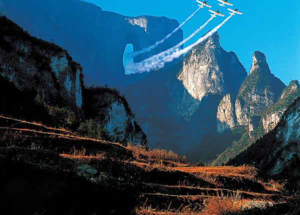 天門(mén)洞風(fēng)光圖片 天門(mén)洞景觀(guān) 1700多年來(lái),這一道奇絕天下的勝景吸引著無(wú)數(shù)的探訪(fǎng)者趨之若鶩。特別是在1999年,世界特技飛行大師駕機(jī)穿越天門(mén)洞,在全球引發(fā)了轟動(dòng)效應(yīng),收看現(xiàn)場(chǎng)直播的觀(guān)眾達(dá)到8億之多。