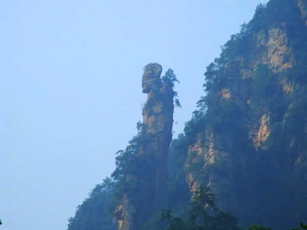 三姐妹峰 轉(zhuǎn)閣樓 是一座拔地而起的石峰,峰頂空心有“窗”,整個(gè)石峰遠(yuǎn)看像一座多級(jí)寶塔,近看又似一座轉(zhuǎn)盤閣樓。由一條羊腸小道盤旋而上,可直達(dá)樓頂。轉(zhuǎn)樓低層巖石成一環(huán)形回廊,人立石廊之中,秀巒依偎。石樓一側(cè)另有石室相附,闊容百人,與閣樓一主一仆,相映成趣。入十里畫廊約30米,有一石峰恰如一老壽星迎面站立,五官輪廊分明,短頭發(fā)長(zhǎng)眉毛,眼睛深邃,笑容可掬。他左手高高揚(yáng)起,似在招呼遠(yuǎn)方游客。壽星形神兼?zhèn),堪稱奇觀。壽星迎賓:在十里畫廊觀光,第一個(gè)景點(diǎn)便是“壽星迎賓”。那一座酷似老壽星的石峰,形同一個(gè)耄耋老人正招手示意,喜笑盈盈,恭候來(lái)客光臨呢!