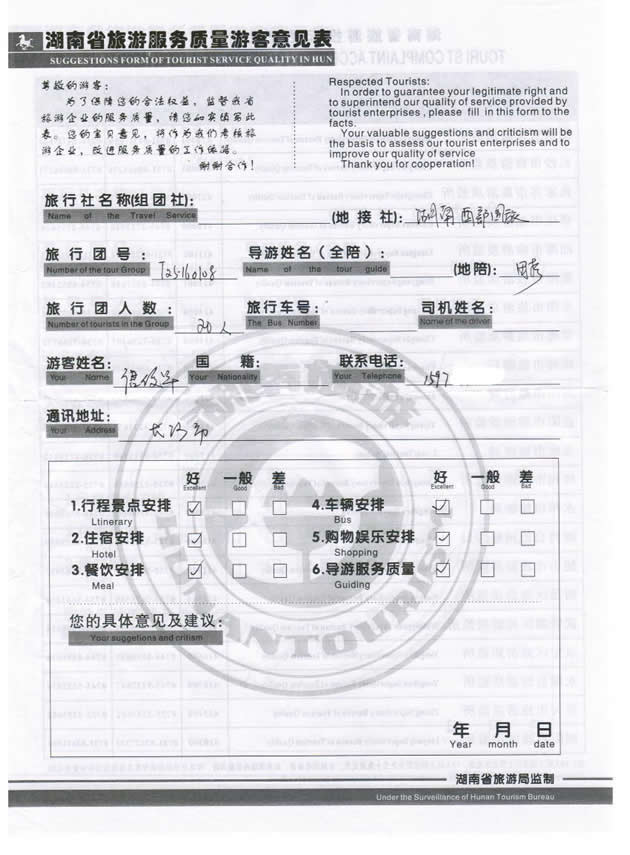 1月份,長沙舒錦一行21位貴賓與湖南西部(張家界)中國國際旅行社工作人員——張群取得聯(lián)系,經(jīng)過商談,雙方達成協(xié)議并簽訂旅游合同,于1月8日抵達張家界,開始張家界之旅。此次行程是由我社優(yōu)秀導(dǎo)游——田杉負責(zé)旅游接待工作,田導(dǎo)在旅游過程中講解詳細,客人也很滿意。同時也感謝長沙舒錦一行貴賓選擇湖南西部(張家界)中國國際旅行社,以及您對湖南西部國旅的信任與支持。我們會繼續(xù)努力,做好旅游接待工作。期待下一次與您的合作,祝您愉快!
